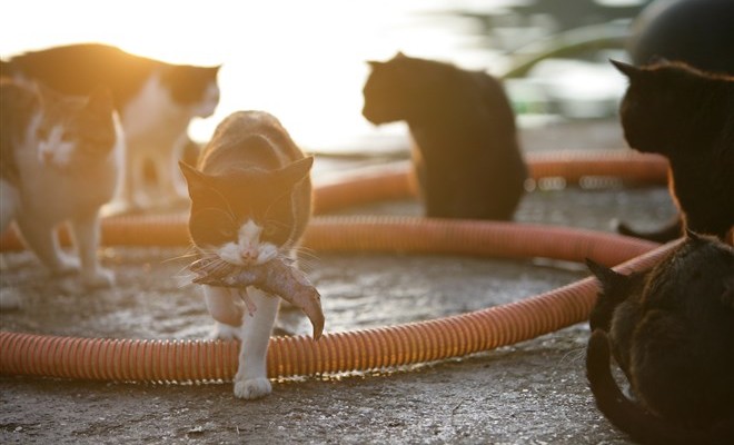 田代島,是日本國的一島祕境,平日寧靜得不可思議,島民多為老人、島上亦沒有食堂、商家,一般旅人到島上大多暫留數小時便離去,但秉持「哪裡有貓,哪裡去」的貓夫人,以不流暢的日文訂下民宿,一待就是兩天,島上唯有港口是平坦的路面,其他望眼皆是崎嶇山路,除了載送漁貨及居民家用車,沒有其他交通工具,她決定揹著相機徒步漫遊,晴空白日,她在碼頭捕捉漁民捕魚縫網,群貓穿梭其間,覬覦著上岸鮮魚的畫面;傍晚時分,她拍下三兩貓咪佇立於港灣,呆望大海的恬靜瞬間,溫煦夕陽染紅海洋,粼粼波光成了天然的反光板;入夜後,島上杳無人煙,簡單不過的生活有群貓相伴,這一刻,這片島嶼只屬於她與貓。