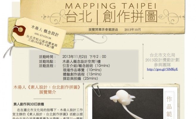 在決定競選世界設計之都的那一天開始,台北熱鬧了:2010 臺北國際花卉博覽會、2011 世界設計大會、2012 世界設計論壇,2013 設計攪動計劃⋯⋯,無論是國內的設計小活動,國際性的大展覽,都開始在這個城市不斷地發生,成長。而2013 設計攪動計畫強調的三大精神「共同創造」、「市民需求」、「設計創新」,在在與木昜人設計工作室提倡「素人創作」的概念不謀而同,因此《素人設計:臺北創作拼圖(Mapping Taipei)》計劃(以下簡稱Mapping Taipei)在這個氛圍之中順利的展開。