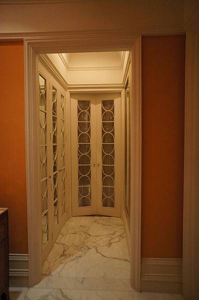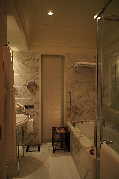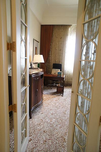 總之, 進了房間後, 管家很親切的問了我是否需要喝點甚麼,因為剛到那天晚上孟買下大雨, 感覺可能快感冒了,因此我告訴管家我想要一些熱茶,10分鐘之後就有人送了一杯加了蜂蜜檸檬的熱茶上來了…一進房後, 會先到玄關,首先就先看到了左邊大理石台, 看來就是要拿來放行李的吧!?右邊是廁所,前面則是休息的房間. (可以看的到有檯燈那邊), 我把房門關上後又照了一張.