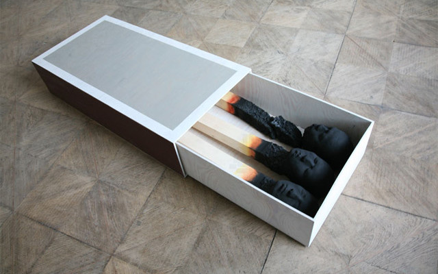 當你離作品有一些距離時,你可能以為這些火柴上的面孔是喜樂的表情就如圖搖頭公仔,但當你站近些,你將發現每張臉是如此無生命力、死氣沉沉的,而放置在一旁的火柴盒就如同一具具的棺材。