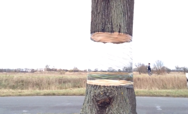為什麼有漂浮的樹幹!!好啦其實不是外星人,是在德國的藝術家 Daniel Siering 和 Mario Shu,他們將樹幹裹上一層塑膠膜,並且使用噴漆詳盡的畫出背景的圖樣,讓人真的誤以為它漂浮在空氣之中呢!讓人聯想到 Joakim Kaminsky和 Maria Poll的作品 mirror installation,只是他們是用光的反射製造出的效果。