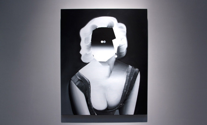 來自日本的平面設計師、當代藝術家 Tomoo Gokita 最近在 Mary Boone Gallery 辦了一個展覽,這系列的作品是以黑白色調為主軸,並將知名的流行文化符號搭配上模糊的面孔,代表著這些曾經知名的人士在我們心中逐漸模糊消逝。將圖片加上擦拭掉的質感和色塊並置在一起,灰色色調讓畫面更加強烈,印象深刻。