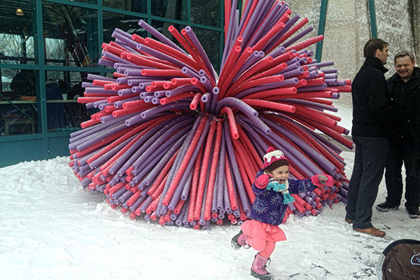 從他的外觀上你明顯發現他跟我們傳統定義的“小屋”有所差別,乍看像是我們常碰到的的絨毛玩具,但其實在其內層為一個儲溫部件,外面則是用發泡塑料製成的柔軟導管,使人們可以任意的爬上去休息或是躲進去避寒,光是看到五顏六色的毛球狀,就讓人有一種暖烘烘的感覺。