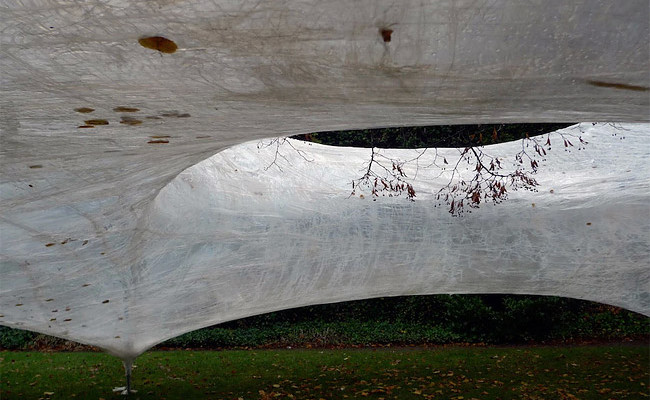 這不是恐怖的大型蜘蛛網,也不是什麼冰天雪地,這是由 Numen/ For Use 集體設計出的交互式裝置藝術,採用的是厚的透明膠帶呢!通過拉伸,纏繞和包裝的膠帶緊緊捆繞接地柱、梁、樹木或其他物體創造出堅韌的空間,這座大型網絡可讓大眾爬行,堅強得足以承擔人的體重。你可躲在下面野餐,也可爬到上面小憩一會兒,真是個有趣的創意裝置藝術啊!