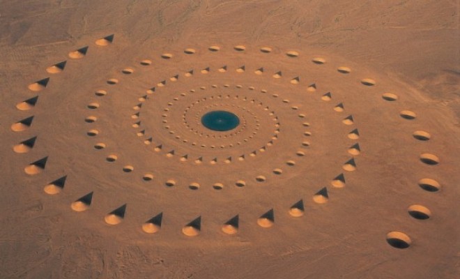看看以下這些驚為天人的作品,他們絕對是瘋子!!不要懷疑,這不是電腦後製合成的效果,這是真真實實在沙漠上所製作出來的大型巨作。呼應著自然的泉水和宇宙萬物的繞行,以鳥瞰的方式觀賞這是一圈又一圈整齊劃一的圓,而從平地上看過去則是一個一個山丘。中央的水池橫跨了100英尺多。Danae-Stratou-Desert-Breath-1-600x398
