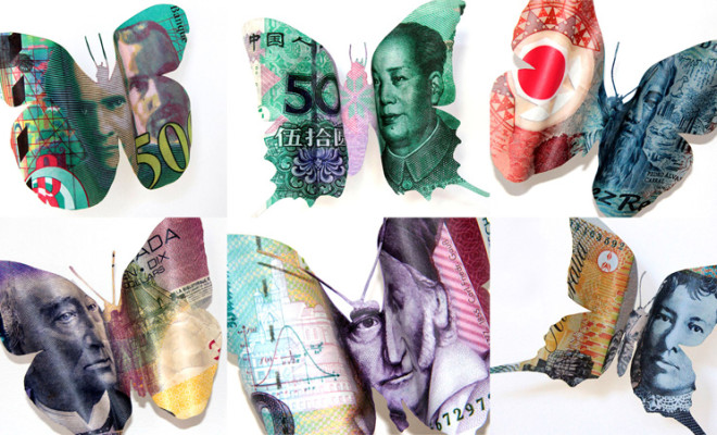 探索金錢的文化和社會觀念 – 以及人們如何涉及到它時,來自紐約的 erika harrsch 將各國紙鈔印刷品以蝴蝶的樣式呈現,放置在一個充滿詩意、好玩的和富有想像力的背景。