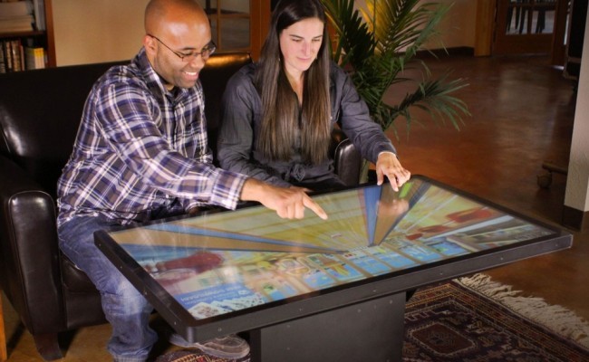 高科技多點觸控茶几!Ideum 是間多點觸控螢幕廠商,他們將 Ideum Platform 46 以及 Ideum Platform 32 搭載微軟 Windows 8 系統後,讓許多新興咖啡店雀躍不已,急著嚐鮮。Ideum Platform 46 和 Ideum Platform 32 顧名思義分別為 46 吋與 32 吋的多點觸控茶几,面板觸控點高達 60 點,相當適合在小型桌上會議時使用,儘管看似放大版的平板電腦,但此平板茶几似乎也讓會議變得如許多科幻電影中的場景呢!