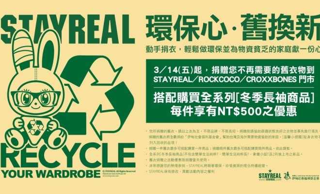 創意品牌 STAYREAL 向來推動環保議題不遺餘力,趁著植樹節之際,響應資源環保再利用的概念,首度大規模舉辦「環保心‧舊換新」的活動。STAYREAL 成立至今,向來以不打折聞名,本次為了鼓勵民眾重視環保與響應回收,特別於3月14日起,祭出優惠的利多活動,呼籲消費者,凡捐出不需要的舊衣至 STAYREAL、ROCKCOCO、CROXXBONES 實體門市,購買冬季商品即可現省500元優惠折扣!希望消費者在為衣櫃換季的同時,能夠將用不到的東西,捐助出來幫助更多的人,此活動 STAYREAL 將整理回收後的舊衣捐贈至「伊甸基金會」,幫助台灣及海外更多需要物資協助的家庭,STAYREAL 號召全員行動捐衣愛地球,改變世界從你我開始!