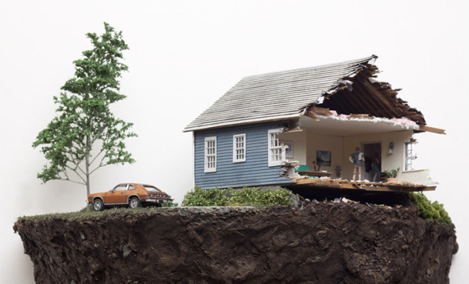 藝術家 Thomas Doyle 創造了這些小世界,就像拇指姑娘一樣,或許我們不知道的地方真的有這些小人類在居住著,而作者不僅僅只是把人物縮小,每一樣作品都有各自的主題和代表的意涵,埋藏在樹中的人、裂了一半的房屋,一起來欣賞這些細緻又充滿故事的作品吧!