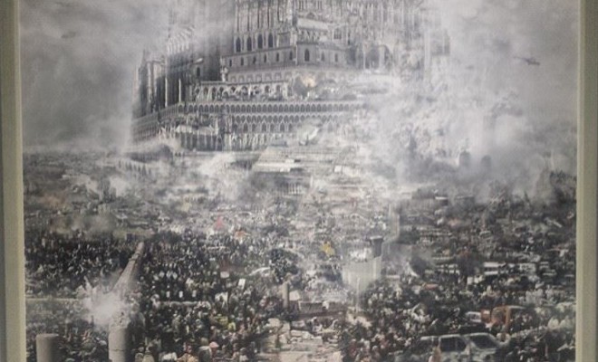 作品畫面上方是建築物,下方則是人群。營營役役的人承托著摩天住宅,在上海的語境下展開,特別有蝸居的諷刺意味;睡著的人支撐著繁華都市,彷彿揭示生活壓力使人麻木疲累;宏偉建築下的抗爭、衝突都被壓下去,又有種異見無法發聲的無奈。文明不斷演進,我們創造了種種物質,築成多姿多采的城市,卻又最終被城市生活牽絆。所謂的「文明」在杜震君眼中,也不過是一座巴別塔的包袱。