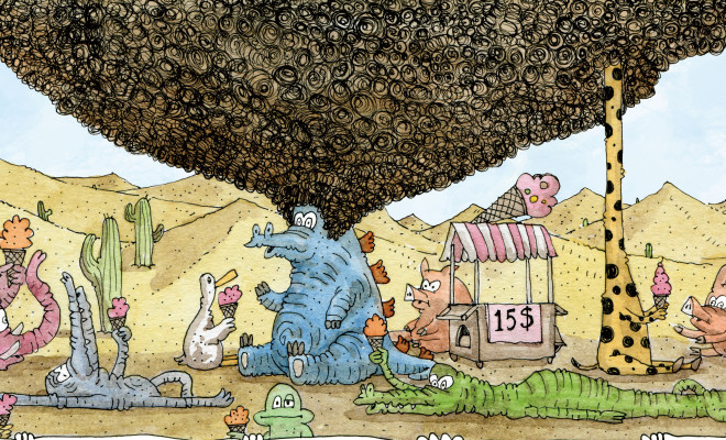 「果然!今天太陽又大又熱!生意一定也會很爛!!」阿藍布魯悲觀的想。