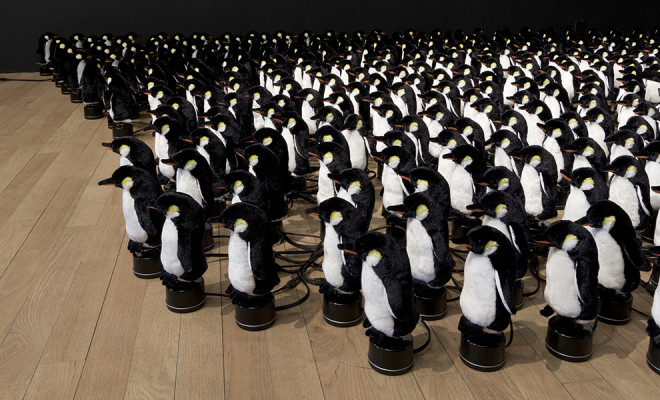 450 隻企鵝玩偶立在旋轉裝置上,形成一片壯觀的「企鵝鏡」。你或許覺得這主意有點荒唐,的確,是荒唐的驚人。就像其他 Daniel Rozin 做過的互動式鏡子裝置,當攝像感應裝置偵測到人的移動時,企鵝會隨之轉動,黑白相間的顏色形成一大片擺動的陰影。