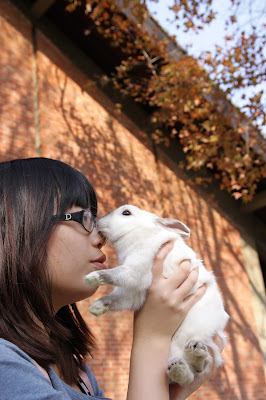 我和兔子真正開始密切的「生活」,大概就是這三兩年,每天例行性撫摸她柔軟的身軀,尤其喜歡把臉埋進熱呼呼的毛髮中、感受他們起伏的呼吸脈動與溫度,偶爾 她會舒服到瞇上眼、眼角成微笑的弧度睡著,嘴巴還會吧喳吧喳的說起無聲的夢話;因為放鬆,她拉長了身軀,依偎在我的胳臂旁相互平行著,而我會輕輕枕著她的 屁股、揉捏蓬鬆的尾巴,聞聞身上的草香,倘若兒時從不離身的安全毯帶來滿溢的安全感,然後像是再次次確認般的吻上她的耳角、臉頰、額頭,確認我對她的承諾 不曾改變,確認此刻此時,她和我處在同一個時空環境,不是做夢,不是幻想。