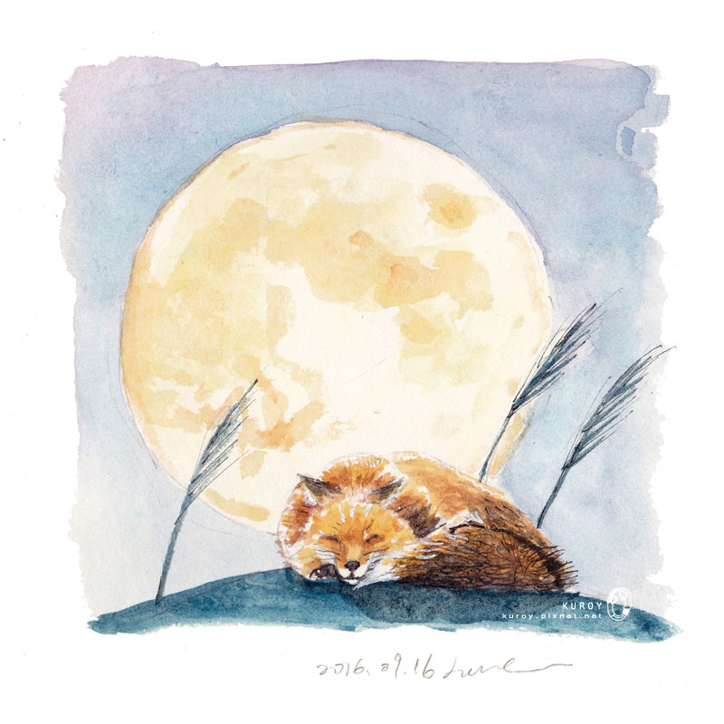 Roy 出題我來畫,第 7 天:月亮與睡著的狐狸 / 月と寝ているキツネ / Månen och den sovande räven