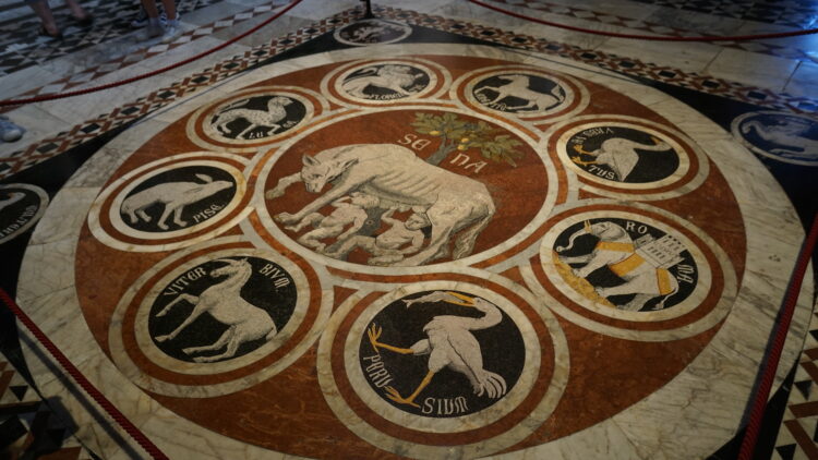 在錫耶納,可以看到與羅馬非常相似,母狼哺育雙生子的圖樣,這是源自於羅馬建城傳說的後續。在羅馬的起源故事裡,流著戰神血液的雙胞胎哥哥羅穆路斯(Romulus)與弟弟雷姆斯(Remus)被流放到台伯河自生自滅,卻被母狼哺育活下來,長大後兄弟鬩牆,哥哥將弟弟殺死並以自己的名號建立了羅馬城。在這故事中,被殺死的弟弟雷姆斯(Remus)有兩個兒子,他們喪父後騎著一白一黑的馬一路向北逃,到中部的山丘地建立新的城邦,也就是錫耶納。這黑馬與白馬敘事也化作現今簡約的黑白市徽,象徵與羅馬的緊密傳承——自古以來,歐陸上有多少城鎮甚至帝國,一心想與古羅馬扯上關係?但是或許只有錫耶納最為特別,能這麼「明目張膽」地在城市中隨處運用這母狼哺育雙生子的城市象徵。