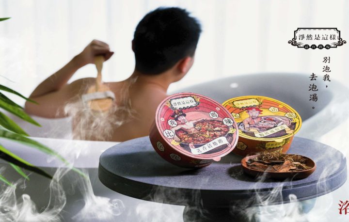 淨然是這樣-清宮浴場,以沐浴為主軸,並以方便麵作為啟發,製作紙碗包裝,以中藥材的特性連結到古代帝王的養生之道,製成中藥「沐浴」物品,讓帝王級的享受隨手可得!