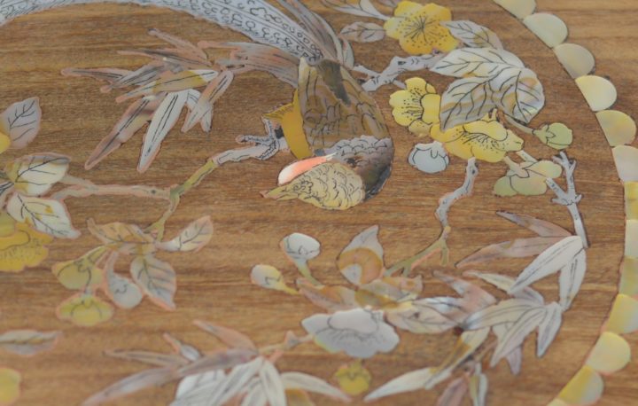 從太師椅的元素出發,適度遵守傳統榫卯結構,在造型上做出些許變化,並鑲上同樣是華美裝飾的螺鈿。中國傳統圖案中有具其意義所在的花鳥畫,而雉雞這種鳥類以諧音「至吉」所為人討喜,因此我在圖案上選擇台灣特有種保育類的雉科鳥類藍腹鷴,同樣作為逐漸消逝的物種,和太師椅跟螺鈿工法有著相同的境遇,希望能喚起人們對於這些事物的記憶並使其得以維護保存。