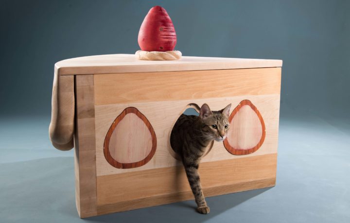 身為主人的我們,常買一些寵物配件,像是可愛的頭飾配件,或者是帥氣的墨鏡、領結等,來裝扮寵物。而從「裝飾」上的行為,我所聯想到的是蛋糕,平凡無奇的海綿蛋糕,透過水果、巧克力和奶油等配件,搖身一變,變成另一種新樣貌,讓人垂涎三尺。蛋糕造型的木製寵物窩,在造型上增添了趣味性,且裝飾上的水果挖洞後,使之具有實質的收納性功能,而主體蛋糕除了是寵物窩之外,亦是休憩用的椅子,讓寵物窩美觀之外,還具有多功能性用途。