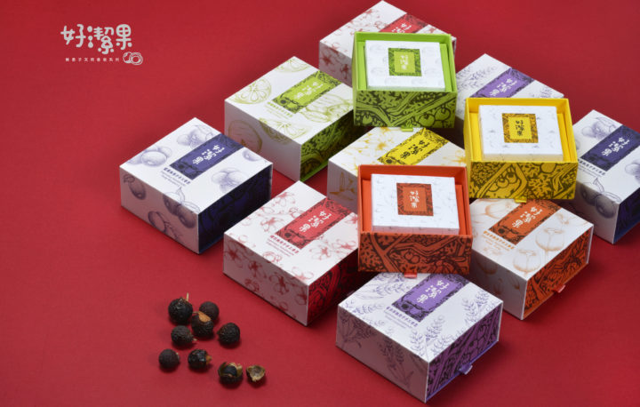 好潔果無患子花果香皂,好潔果音意「好」的清「潔」「果」實,另意以天然為自然帶來好的結果,使用古早清潔果實「無患子」為基底,結合花果芬芳香氣,視覺設計以點描風格繪製花果圖案,搭配復古版畫的無患子生態圖騰,豐富鮮豔的色彩計劃,包裝設計分為三部分,抽拉式結構包裝、雙開式結構包裝、禮盒形式,其中以雙開式結構包裝最為特別,為營造花朵綻放的視覺效果而設計,香皂的外包裝紙也以漸層不規則的圖形呈現繽紛的花朵感,將較為傳統樸素的清潔果實無患子,注入新的意象。