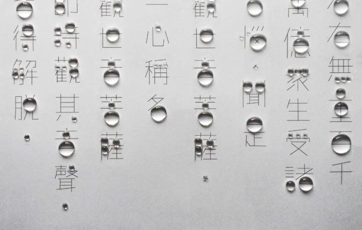 在科技發展快速的當代,是否能有新的可能展現苦行,以獻虔誠的心?縱觀佛教的傳承脈絡,可以發現這些重要的教義都以文字為載體流傳著,「水造佛經」便以文字設計為切入點思考,將佛教中重要的器具-佛珠作為字體設計的基本造型,再使象徵清淨的水滴入中空的佛珠內,一字一句的滴出整本佛經,重現整個清淨的過程行為。
