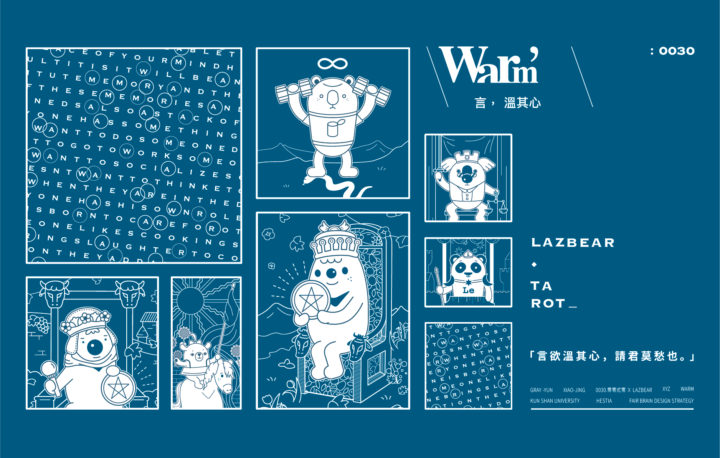 「有你,我就不想放棄!」結合Warm ──言,溫其心「言欲溫其心,請君莫愁也。」的核心精神:言語賦予溫暖的力量,讓「不想熊」以「塔羅牌」的形式,陪伴遇到煩惱或是困境的你我;對於下一步該如何進行感到迷惘時,塔羅牌可以指引你前行的方向與力量。