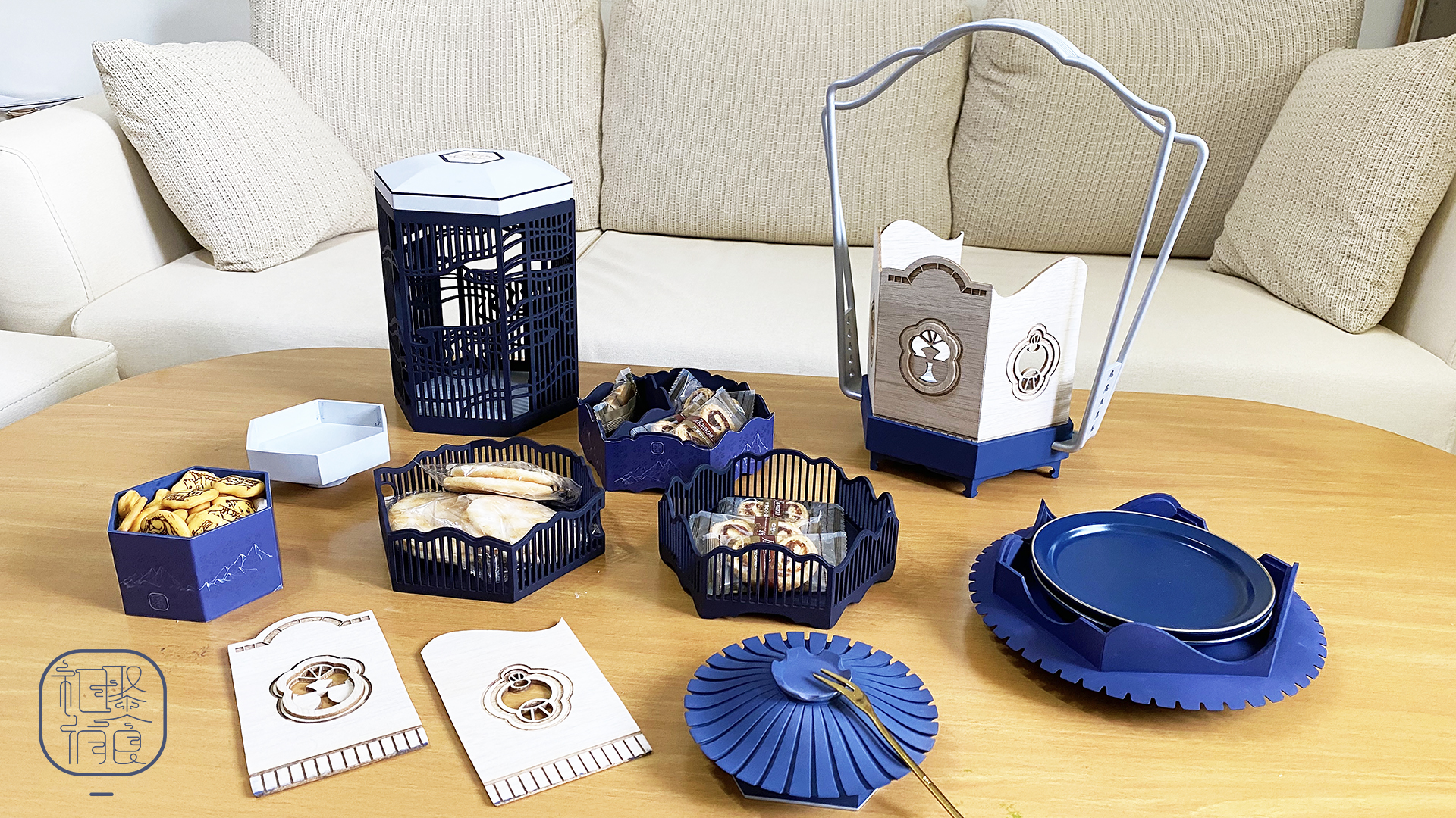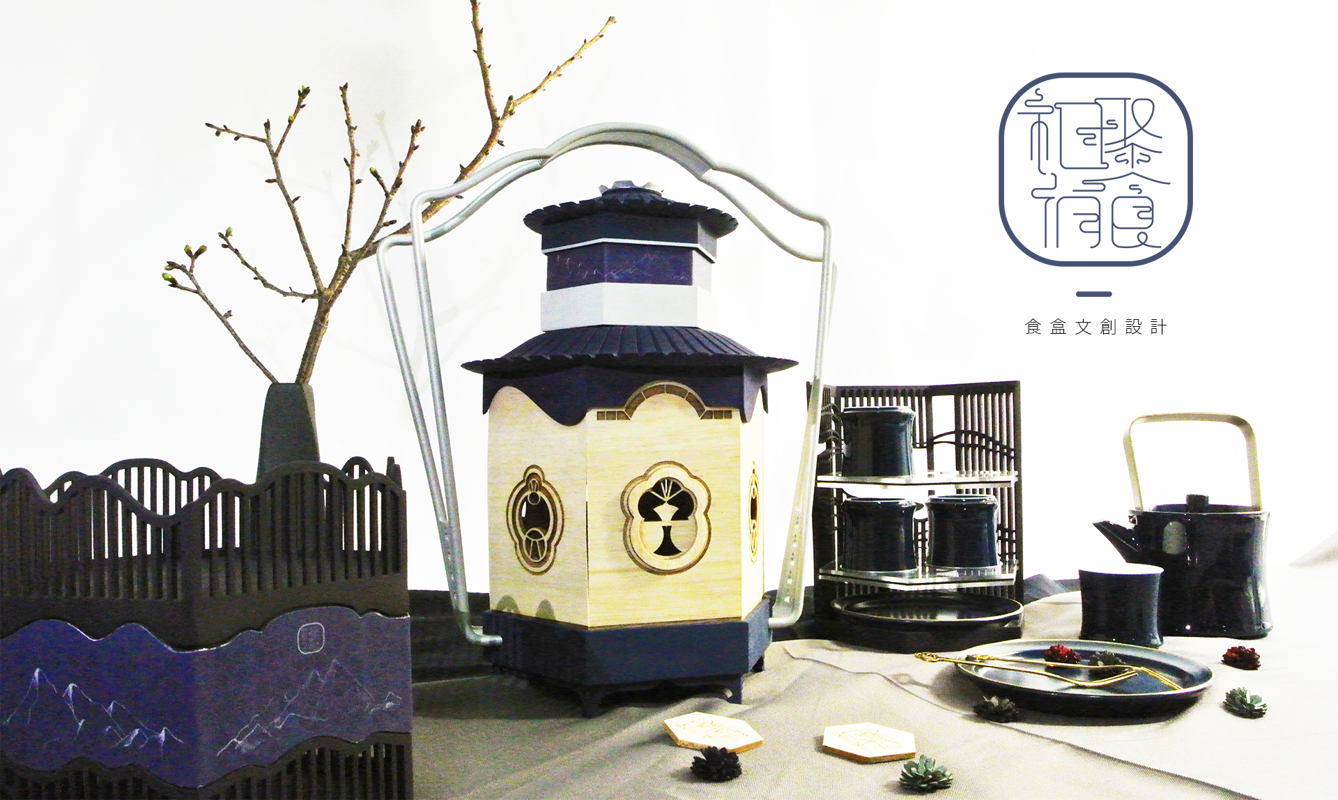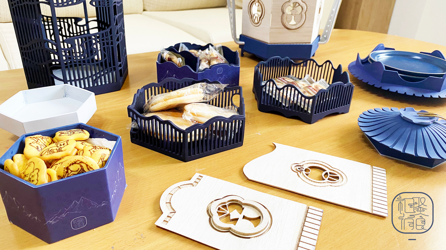本食盒的設計在外觀上採用雲紋、窗花、山脈的元素並以簍空的設計手法,運用複合材質的變化,能作為不同以往古代食盒的設計特徵。