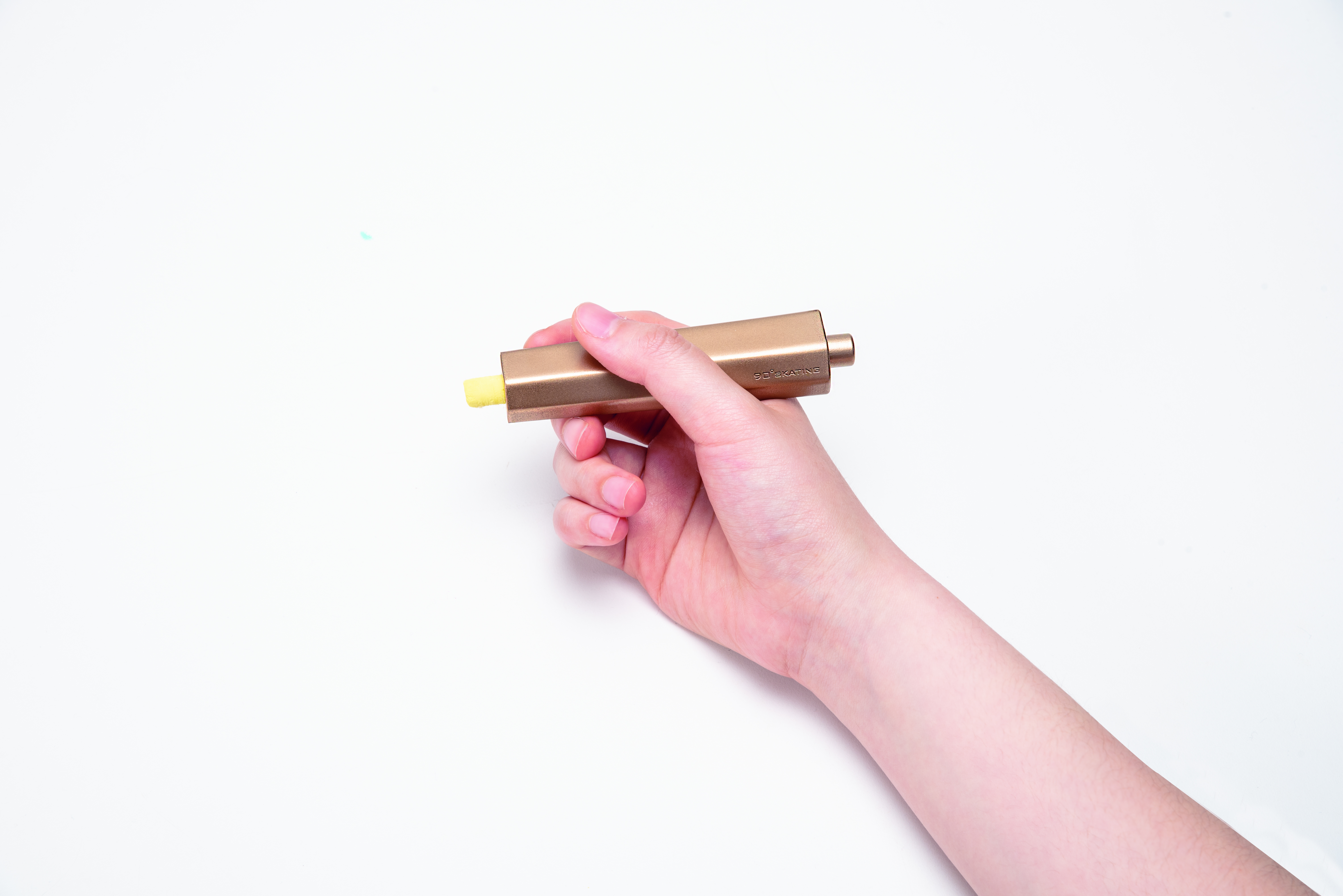 在粉筆夾的部分我們設想了兩種,一種是單色粉筆夾而另一種是雙色粉筆夾,單色粉筆夾其實在現有的市面上已經存在,但是普遍老師卻不愛使用,於是我們在發想之前透過問卷去向老師了解為何不願意使用的原因,而前三者分別是不好攜帶、使用不不便、跟筆身不好握取,於是我們針對了這三個問題點重新塑造現今的粉筆夾,考量長時間的使用,不同的臥姿與使用施力點,設計成手掌虎口的造型更加貼合使用者,利用長短邊的組合搭配成不規則角形,使用時將粉筆放入後,利用旋轉的方式轉出。