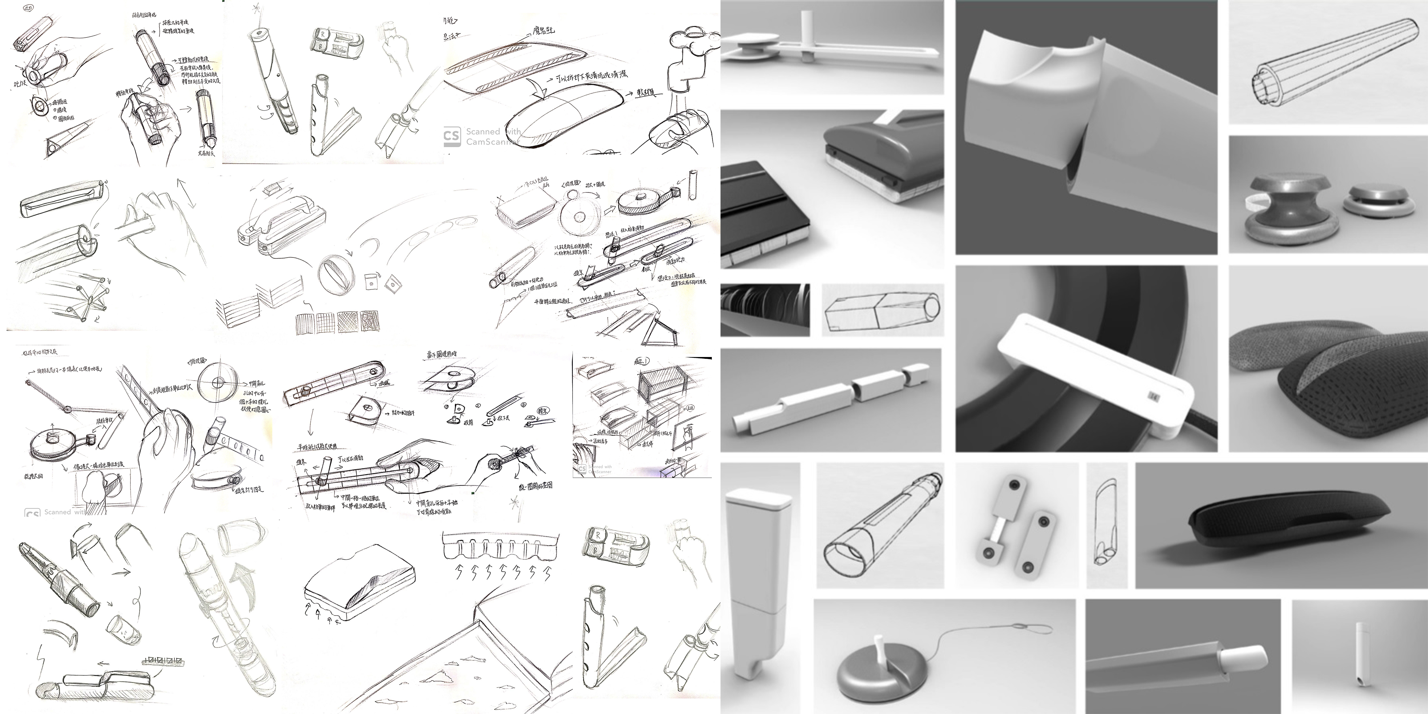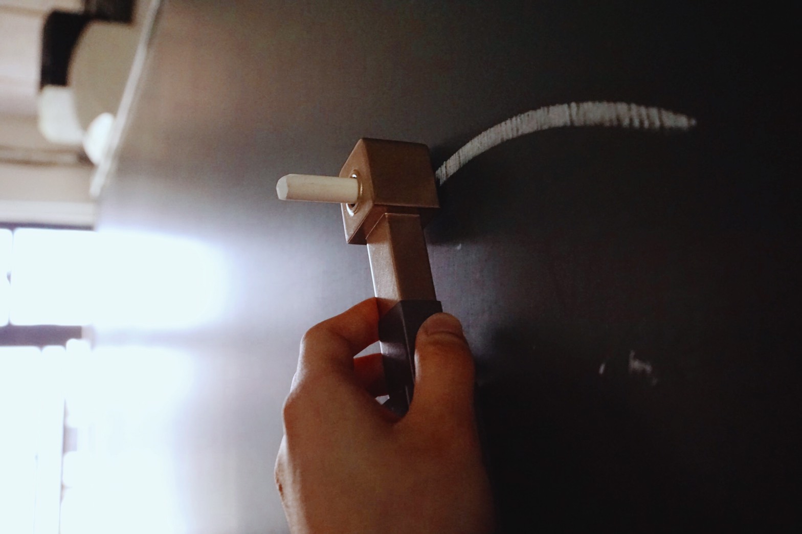 所以我們開始研究現有的產品,以及問卷與訪問回饋後,我們了解到目前多數教師、教育者在板書書寫的使用習慣,與在使用舊式黑板文具的困擾點,將產品的問題點去做改善及創新,替所需功能重新定義,並將未解決的缺欠進行改善。其中像是:「長久握持筆桿的不適、如何方便的抄寫簡潔卻又不單調的板書、作圖的黑板圓規不便攜帶與操作、以及板擦在短時間如何清潔與達到更好的握持」。再反覆的模型測試與改善,得出我們最理想的樣貌,期望讓教學的里程碑上創造出不一樣的可能性。