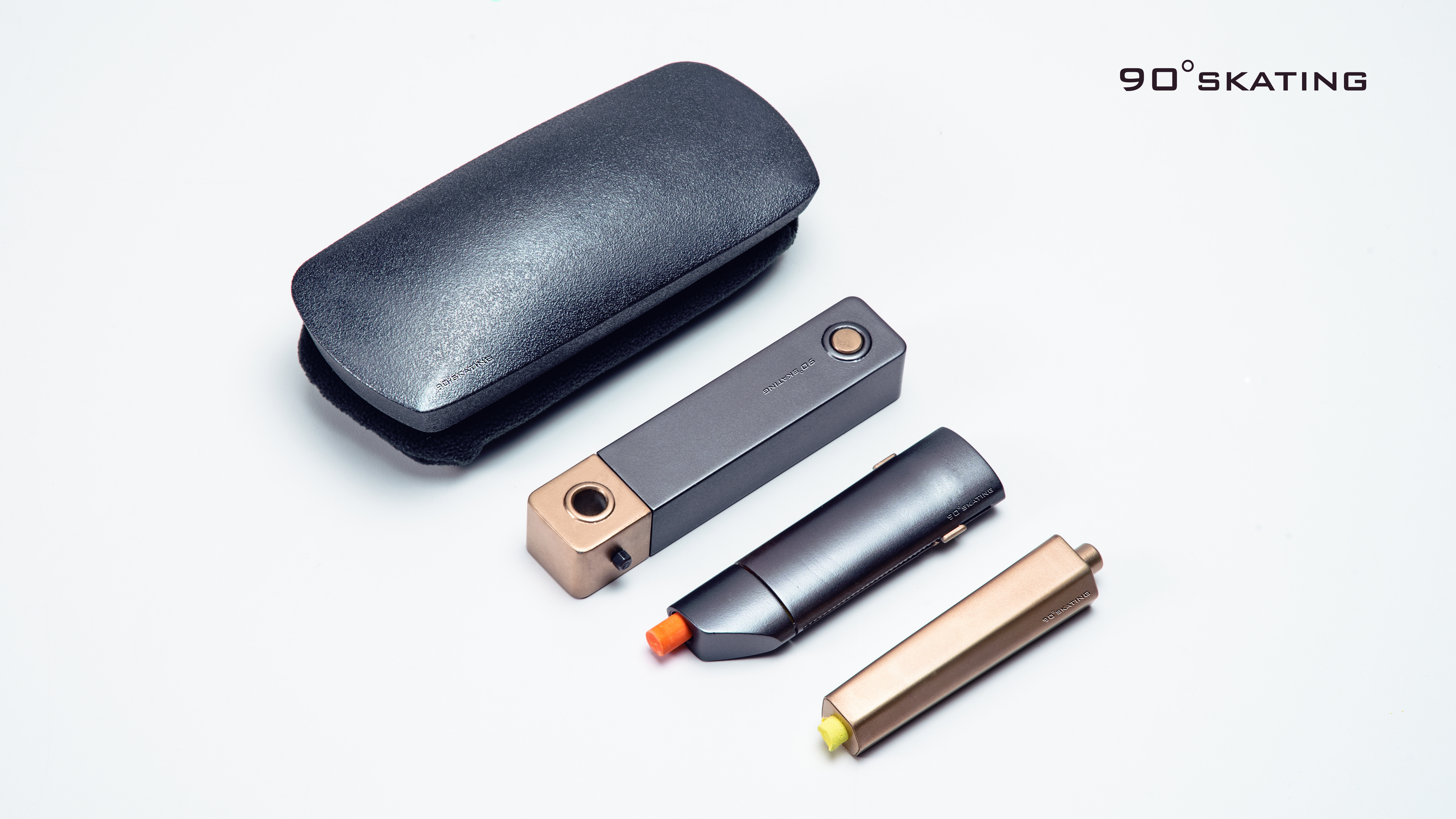 90°skating是一組將現有的教學用具重新改良並且美化的新一代黑板文具。在台灣體制內的教育中,多數使用黑板作為教學呈現媒介,但傳統形式上較為單一化,鮮少改善及創新。例如:「教學用圓規操作方式不方便,粉筆夾的握姿容易使手指不適。」不便的使用,不僅影響教學品質,連帶干擾授課者的情緒。為了讓教師在使用時能夠更加方便及舒適,將「粉筆夾、作圖用具、板擦」所需功能重新定義,進行改善,並重新思量未解決的缺欠,考量每一步的人體工學,讓在使用上能夠更容易操作。