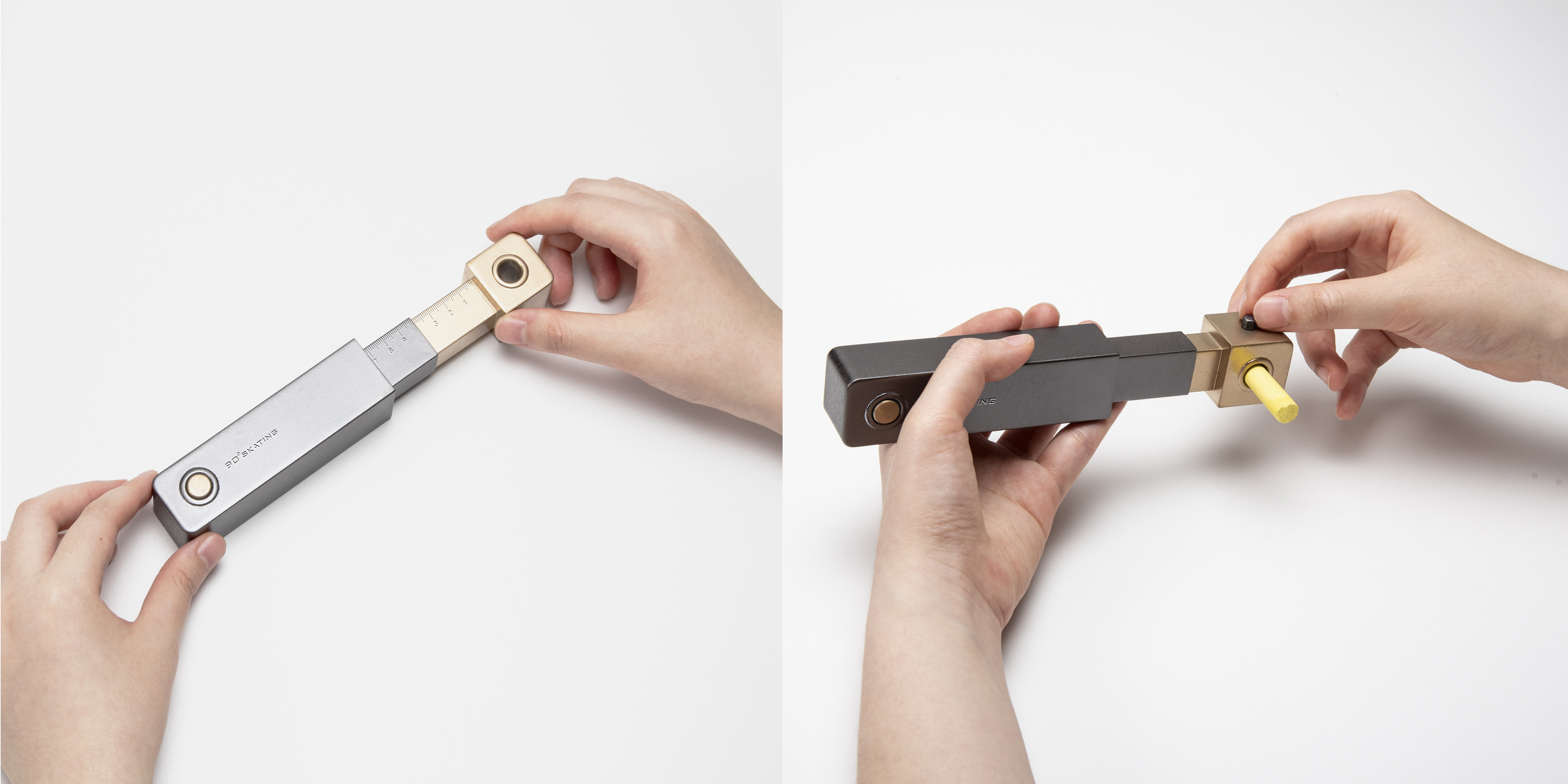 同時我們也針對作圖用具去做設計上的改善,原因是因為發現到現在不管事廠商所附的教學用圓規或是學校提供的教學用圓規,其實只是將文具所使用的原規放大而已,蛋撻並沒有考慮到一個是用於平面上,那用於垂直方面呢?還會是一樣好使用嗎?不僅使用上有詬病,也不符合人體工學,再整體的操作上也不好操作。於是我們針對了這幾項痛點,再加上現今的黑板大多具有磁性,於是我們將作圖用具結合磁鐵作為圓心的方式去使用。操作上將圓軸心與量尺緊密合一,不僅方便攜帶收納,固定的圓心與拖拉的尺標,單手也能調節操作,輕鬆且單位化圖像。