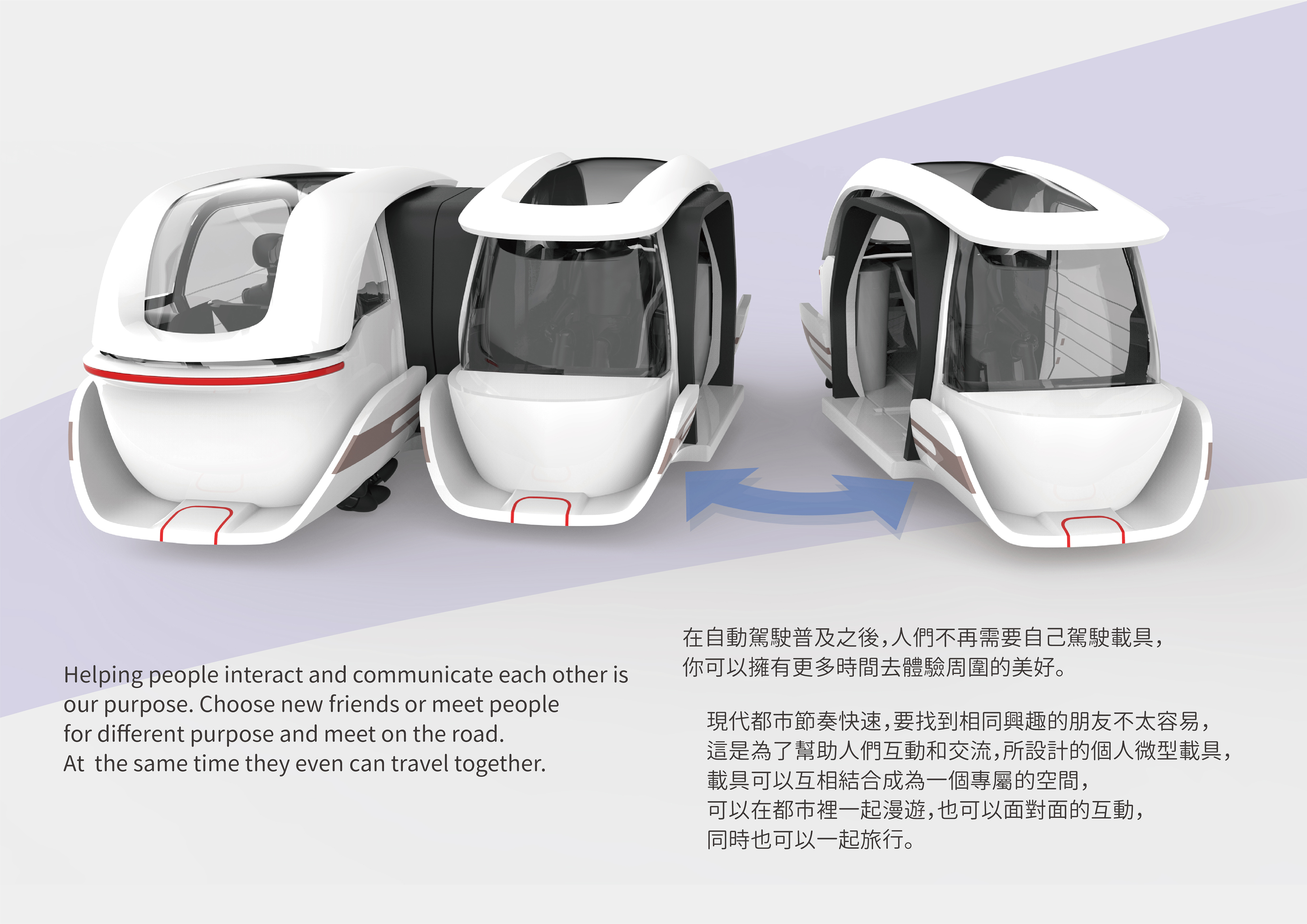 現代都市節奏快速,要找到相同興趣的朋友不太容易,這是為了幫助人們互動和交流,所設計的個人微型載具, 載具可以互相結合成為一個專屬的空間,可以在都市裡一起漫遊,也可以面對面的互動,同時也可以一起旅行。