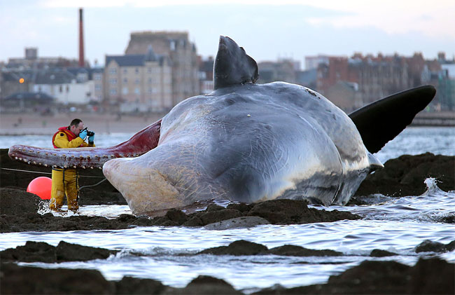 2014年1月11日星期六在愛丁堡,蘇格蘭,海上救難隊拍攝到一隻被衝上波托貝洛海灘的抹香鯨。蘇格蘭警方和防止虐 ……