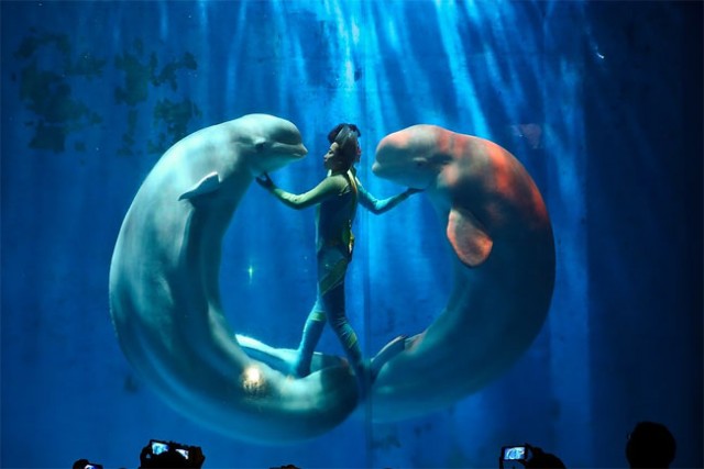 攝影師 Lintao Zhang 於一月七日在 哈爾濱極地館中,拍攝到這些美麗的影像。 潛水者和兩隻大白鯨在水 ……